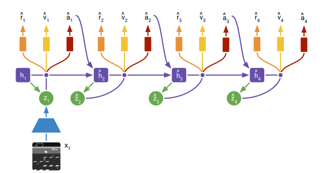 The transition predictor guesses the next model state without using the next image, so we can learn behavior by predicting model states without having to interact with the enviornment and observe images.