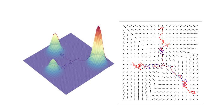 Figure 3: Score based interpretation of the diffusion optimization objective. Optimizing for the score is like moving to one of the modes in the distribution at each time step. The log gradient step defines a vector field along which a randomly sampled data with evolve in time until it converges to one of the modes.