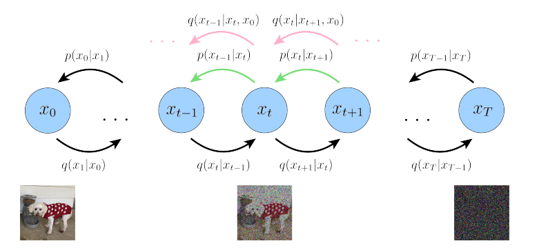 Figure 2: VDM as a hierarchy of forward and reverse diffusion processes. The aim of the diffusion model is to minimize the difference between the distribution between the pink (Gaussian noise corruption step) and the green (denoising step) arrows.