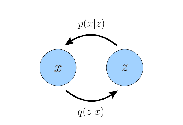 Figure 1: VAE depicted by the arrows: the forward arrow is the encoder ($q(z \mid x)$) which defines a distribution over the latent $z$ for observation $x$; and the backward arrow is the decoder ($p(x \mid z)$) which defines a distribution over the observation $x$ for some sampled latents.